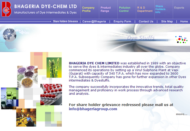 BHAGERIA DYE CHEM LIMITED was established in 1989 with an objective to serve the dyes & intermediates industry all over the globe. Company commenced its operations by setting up a Vinyl Sulphone Plant at Vapi (Gujarat) with capacity of 540 T.P.A. which has now expanded to 3600 T.P.A. Subsequently Company has gone for further expansion in other Dyes intermediates & Dyestuffs.