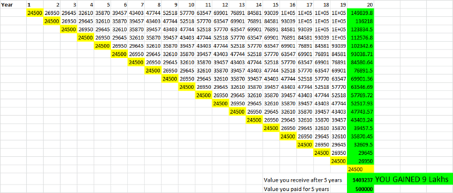 Here you are paying 25000 rupees per year, for 20 years. You pay 5 Lakhs & you receive 5 Lakhs after 5 years.